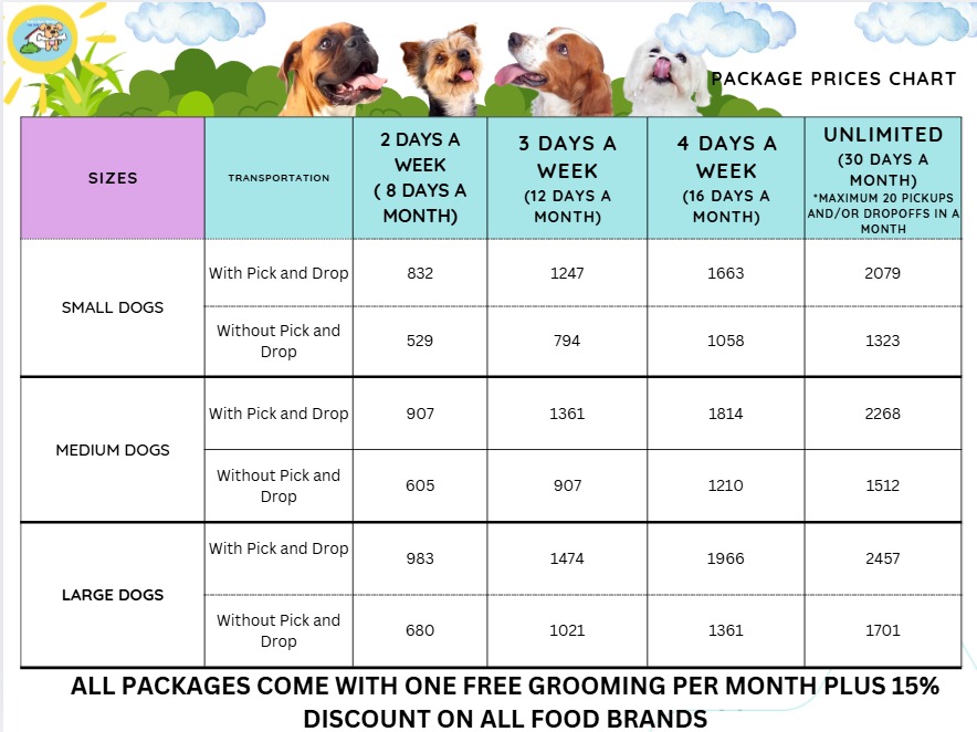 * NOTE: If a dog board with us for more than 3 weeks at a stretch, the rate will be same as Daycare